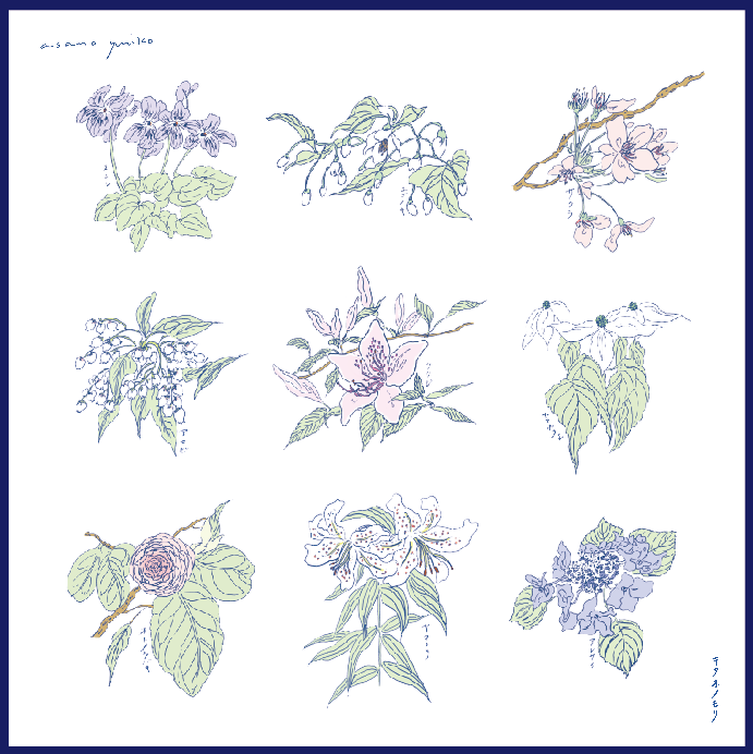 文学館周辺の自然豊かな「北根の杜」に咲く花々のイラストをあしらったハンカチです。