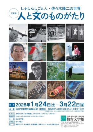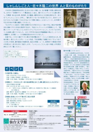 本展では、こだわり続けてきた東北や宮沢賢治をテーマにした写真をはじめ、宮城の歌人・俳人とのコラボレーション作品、『河北新報』で連載された「きょうはバス日和」の写真、歴代館長の肖像写真、仙台文学館ニュース、四季折々の敷地の自然の写真など、約300点をご紹介します。「しゃしんしごと人」佐々木隆二の写真世界をどうぞご覧ください。