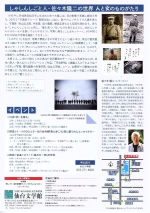 「ものがたり」を紡ぎ、写真で表現するのが好きだという佐々木は、東北や宮沢賢治を主軸にすえた作品を発表するほか、「仙台コレクション」の写真家として、「復興コンサート」や「せんくら」のボランティアカメラマンとして、人々の「ものがたり」を記録し続けてきました。また1999年の仙台文学館開館の頃より、イベントの撮影や、文学館ニュースの表紙写真を手がけてきました。