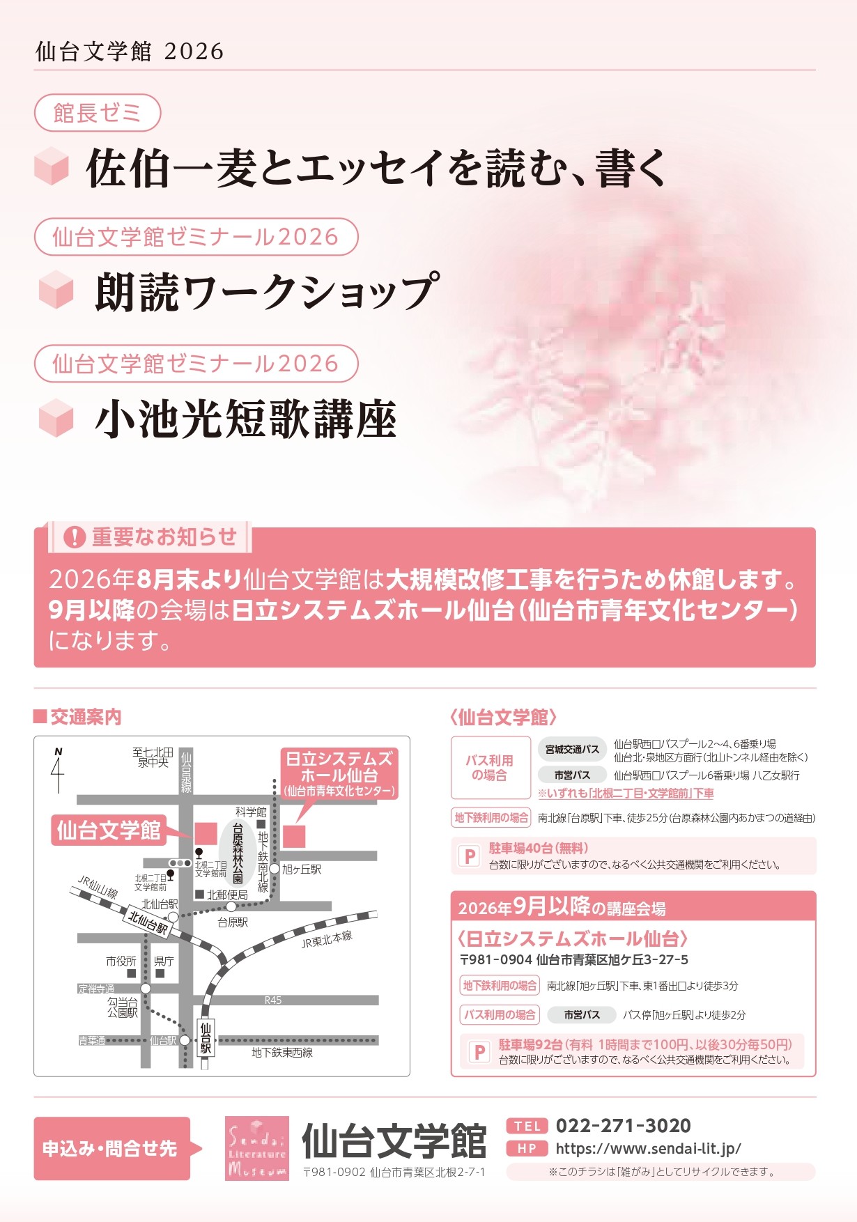 申込み先 仙台文学館 〒981-0902 仙台市青葉区北根2-7-1 TEL 022-271-3020
