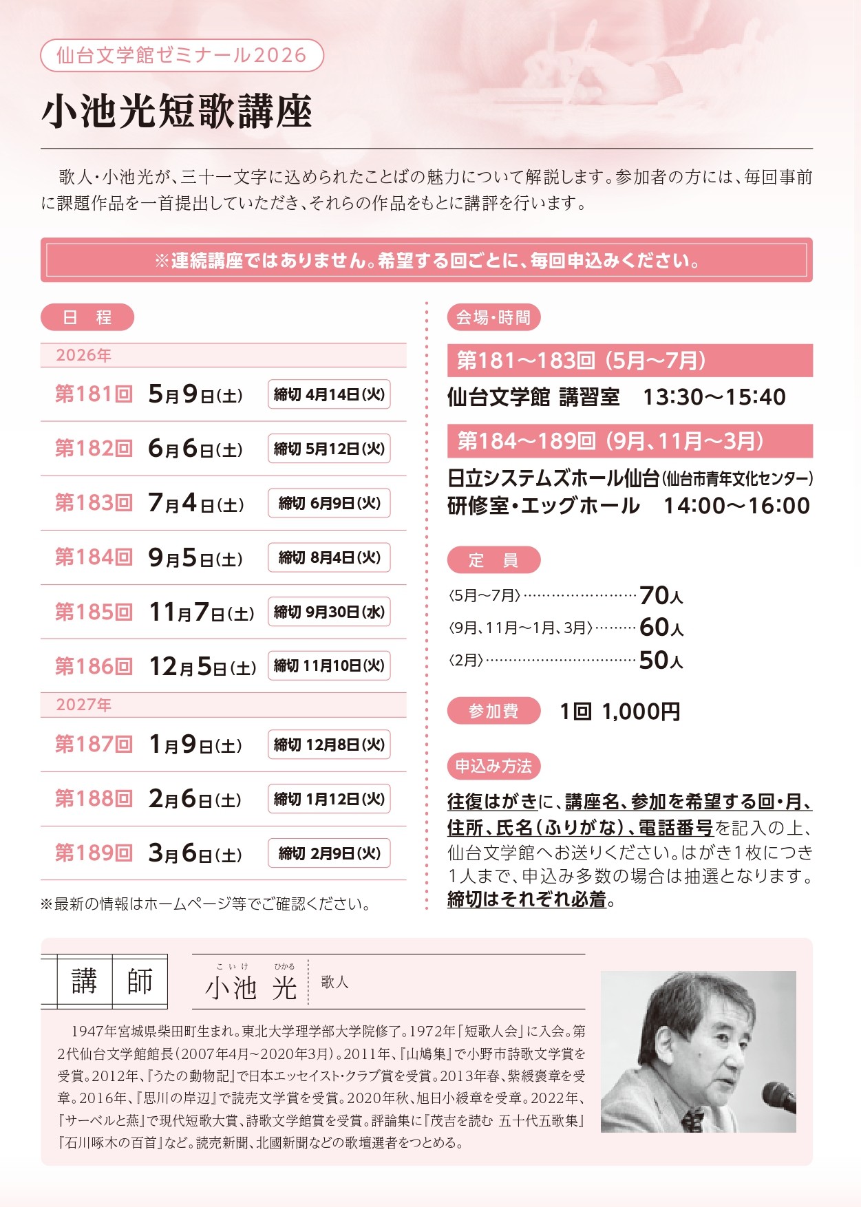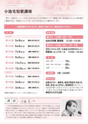 ◆仙台文学館ゼミナール2026「小池光短歌講座」