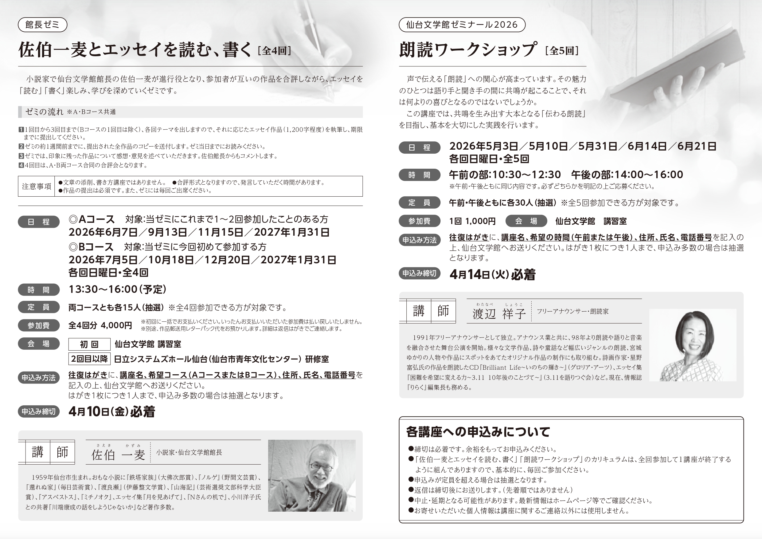 往復はがきに講座名、参加を希望する回・月、住所、氏名(ふりがな)、電話番号を記入の上、仙台文学館へお送りください。はがき1枚につき1人まで、申込み多数の場合は抽選となります。締切はそれぞれ必着です。